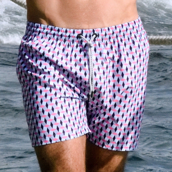 Diese Badehose ist den ganzen Tag über bequem und besticht durch ihr auffälliges geometrisches Muster in Pink, Schwarz und Grau. Sie sieht auf dem Spielplatz genauso gut aus wie am Strand!