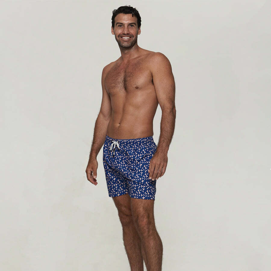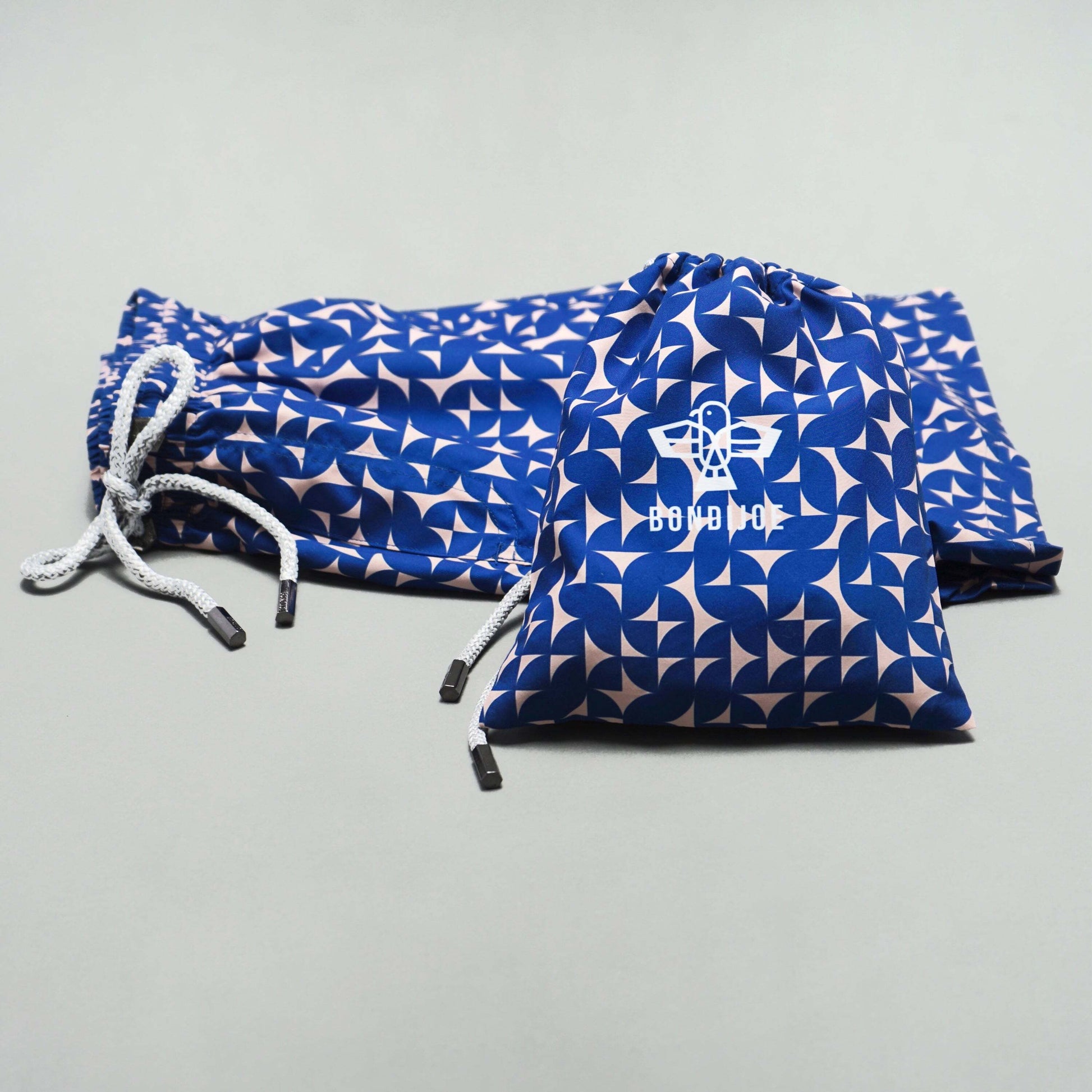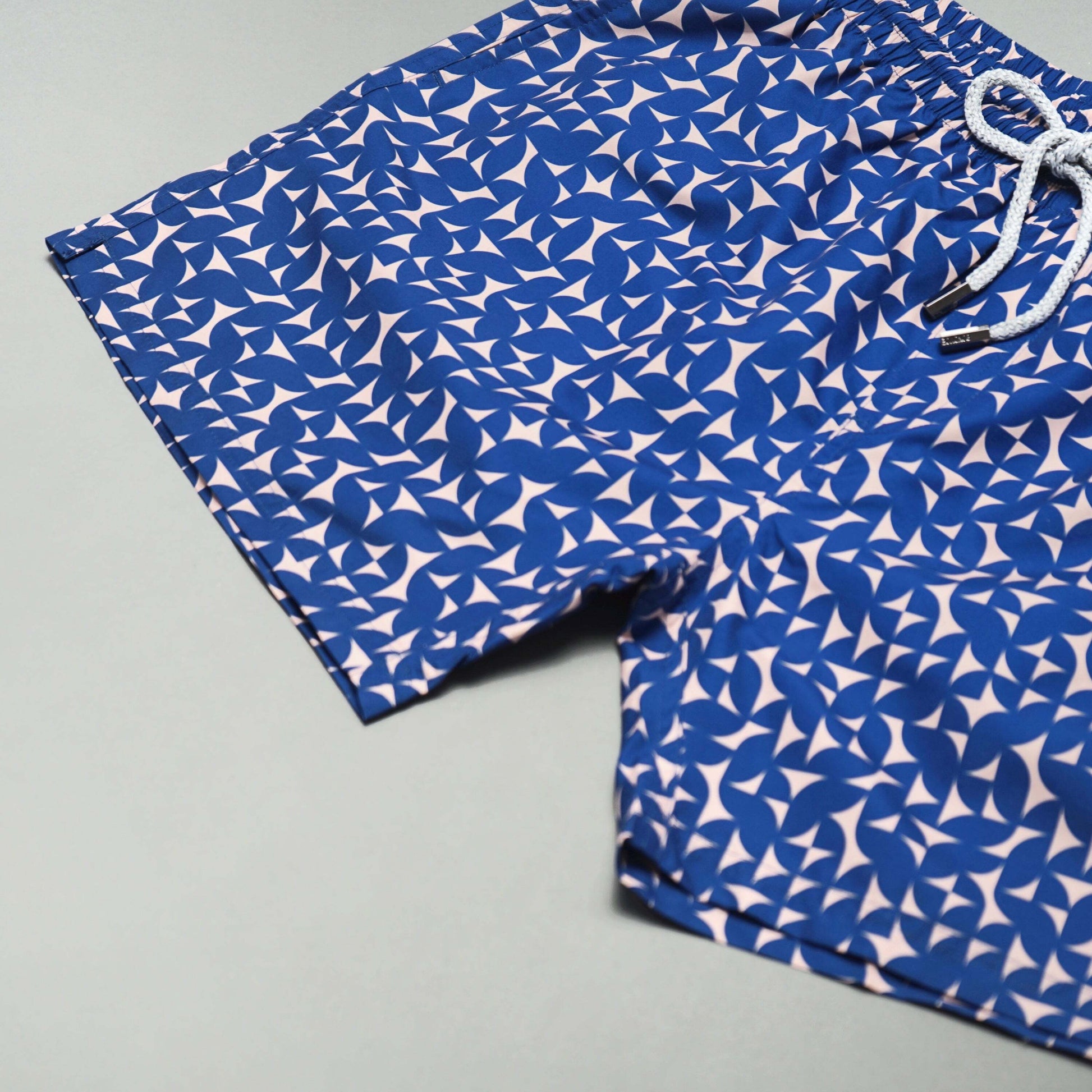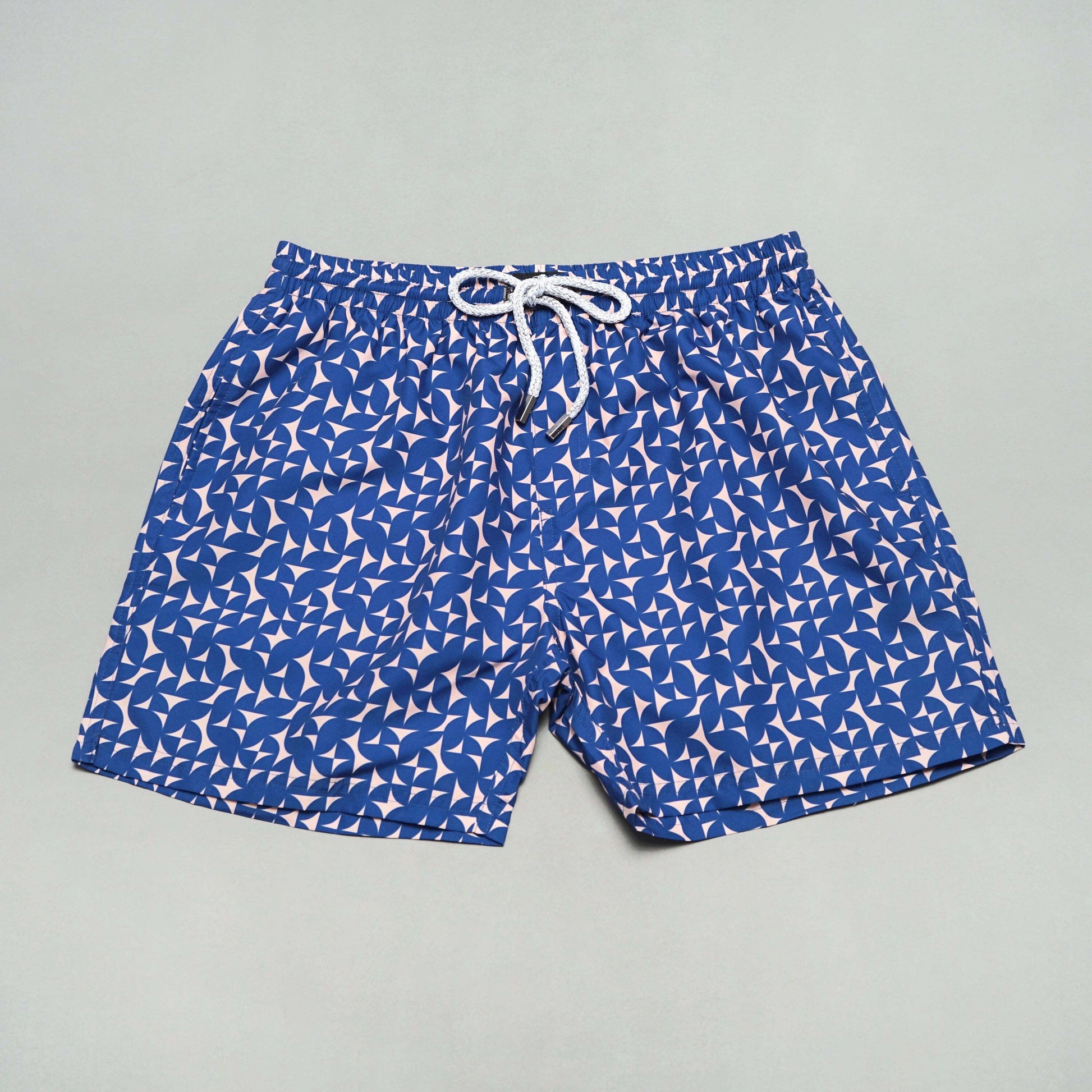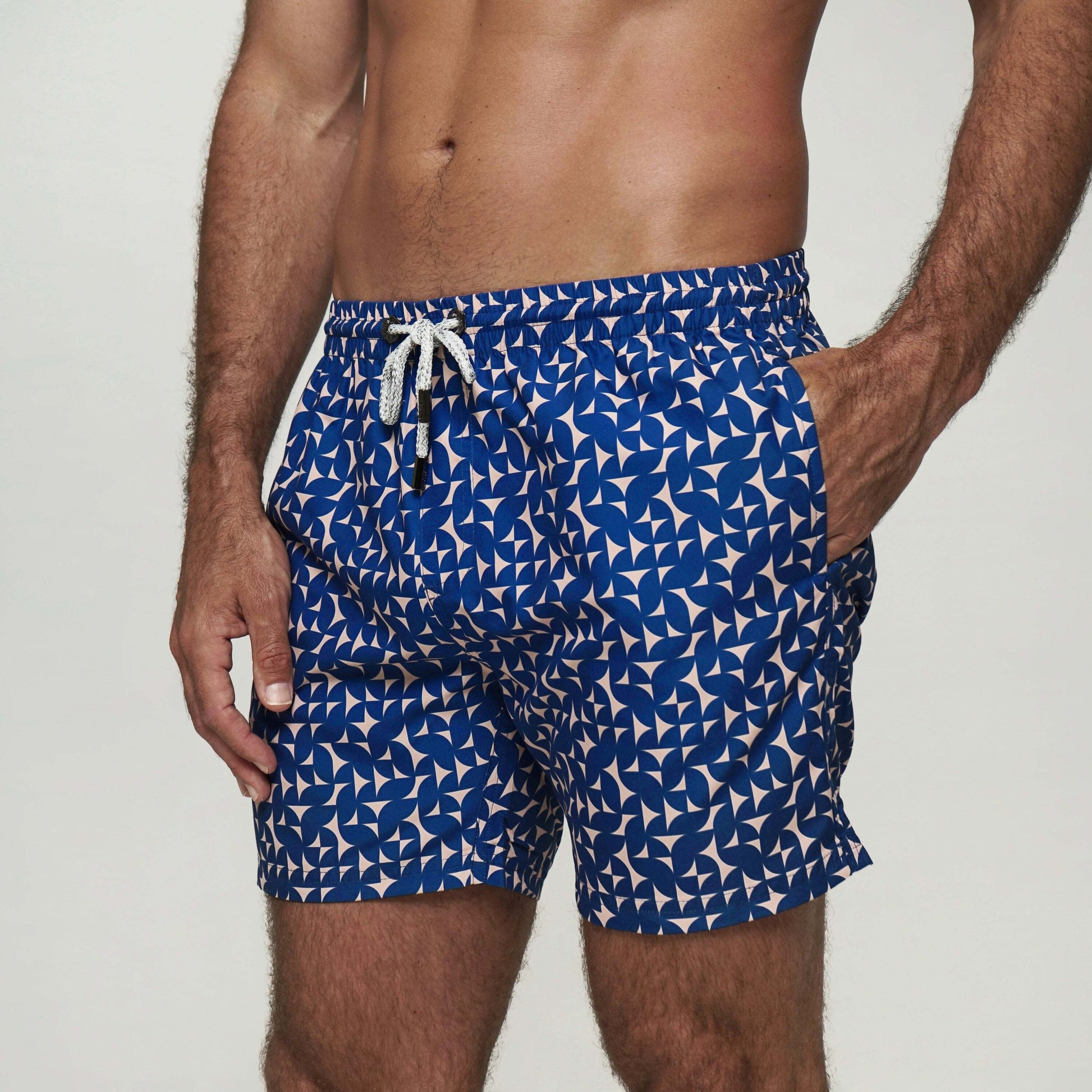 Die „Fletcher“-Badeshorts von Bondi Joe Swimwear vereinen Stil und Funktionalität. Das auffällige geometrische Muster kombiniert kräftige Blautöne mit dezenten Akzenten in staubigem Rosa und Pfirsich. So entsteht ein moderner Look mit entspanntem Küstenflair. Die klaren, kantigen Formen in verschiedenen Blauschattierungen erinnern an die Tiefen des Ozeans, während die sanften Pfirsichfarben dem Design Wärme und Eleganz verleihen.