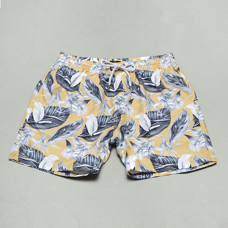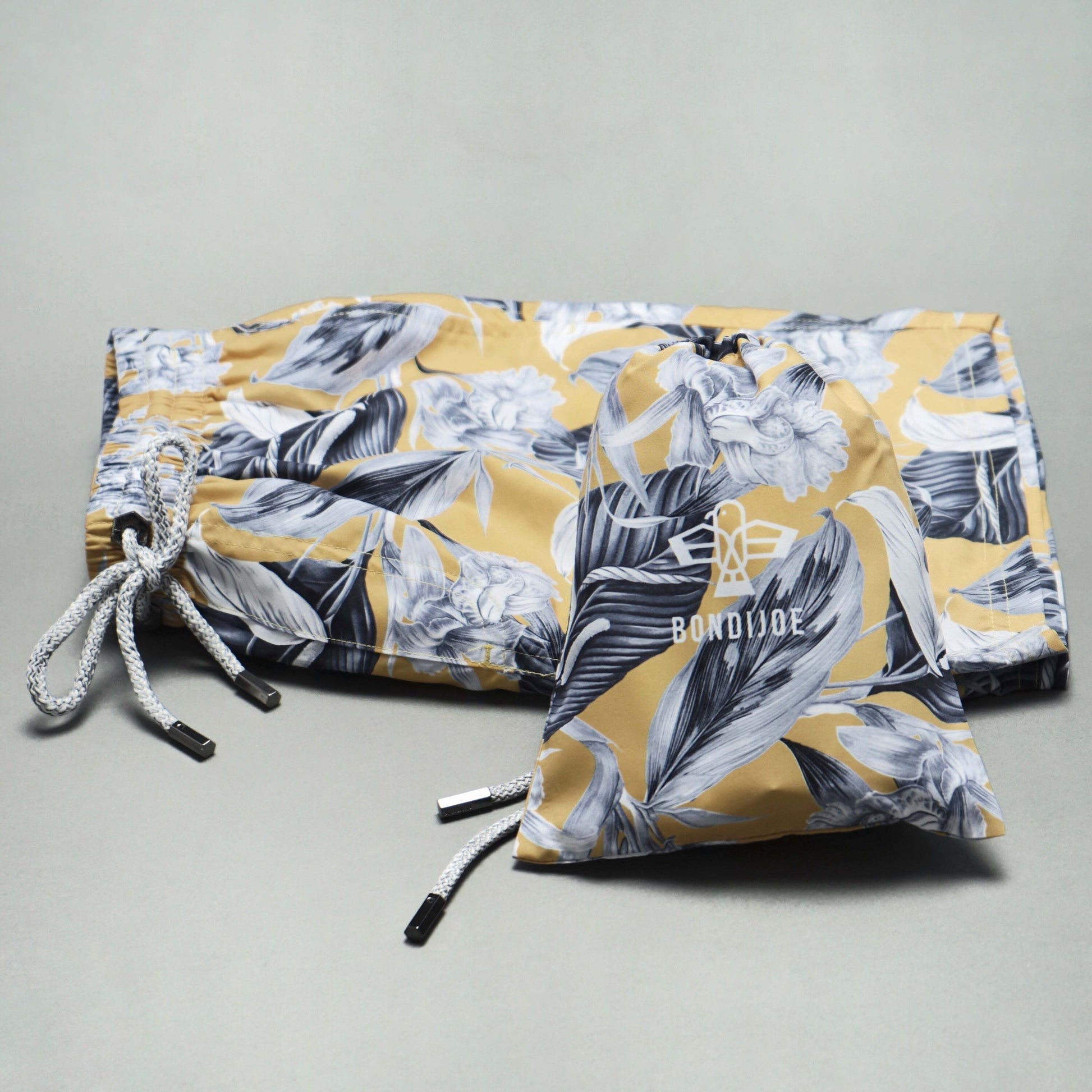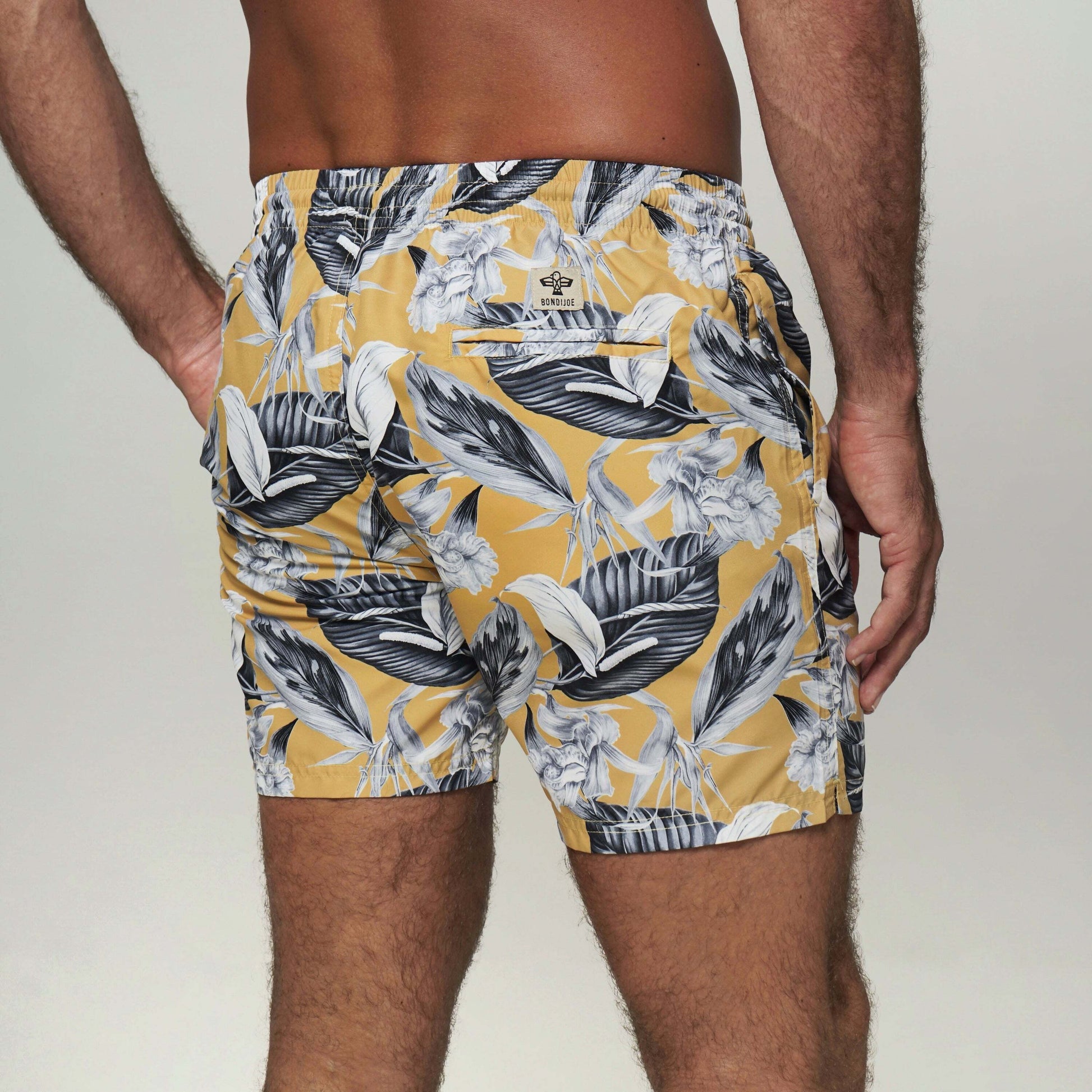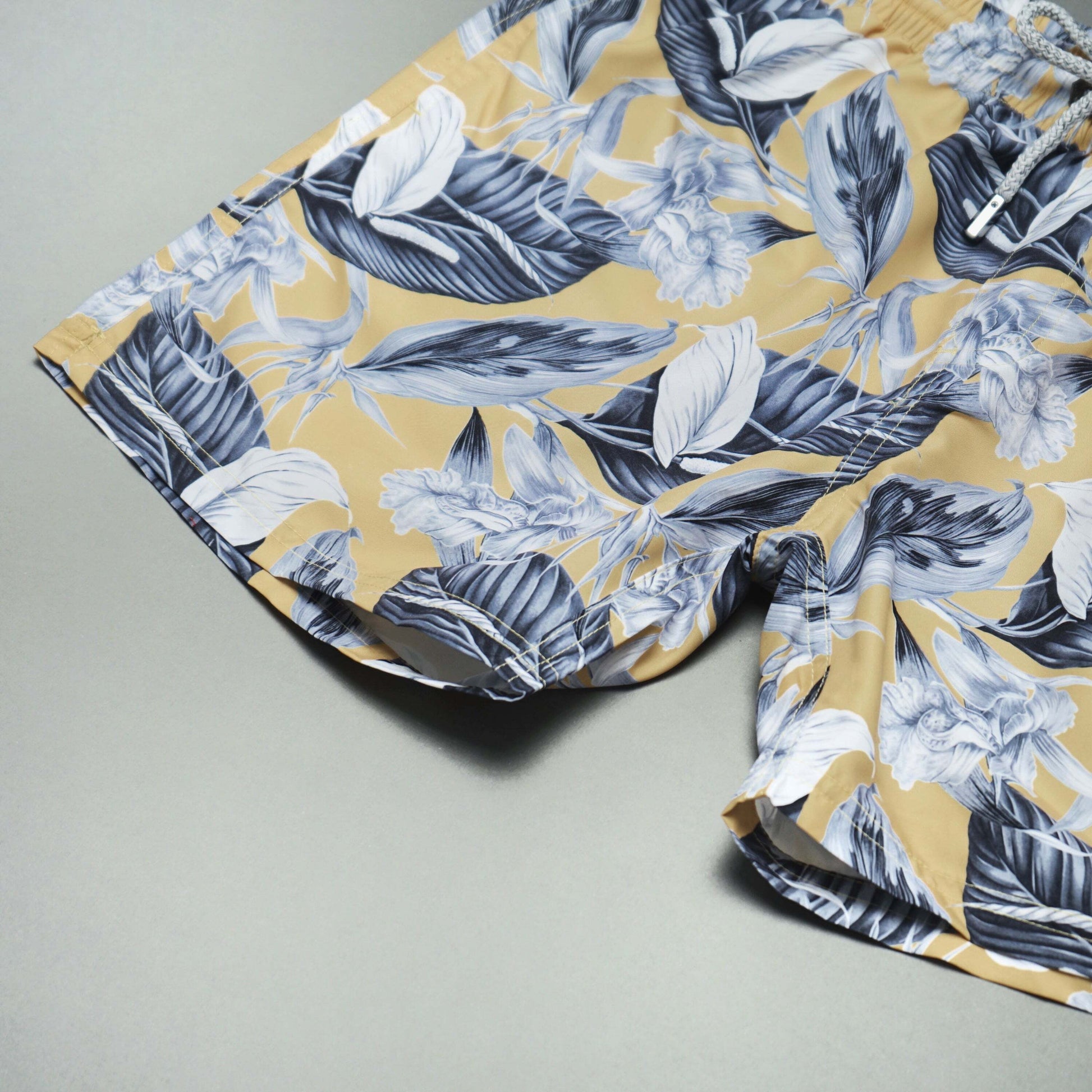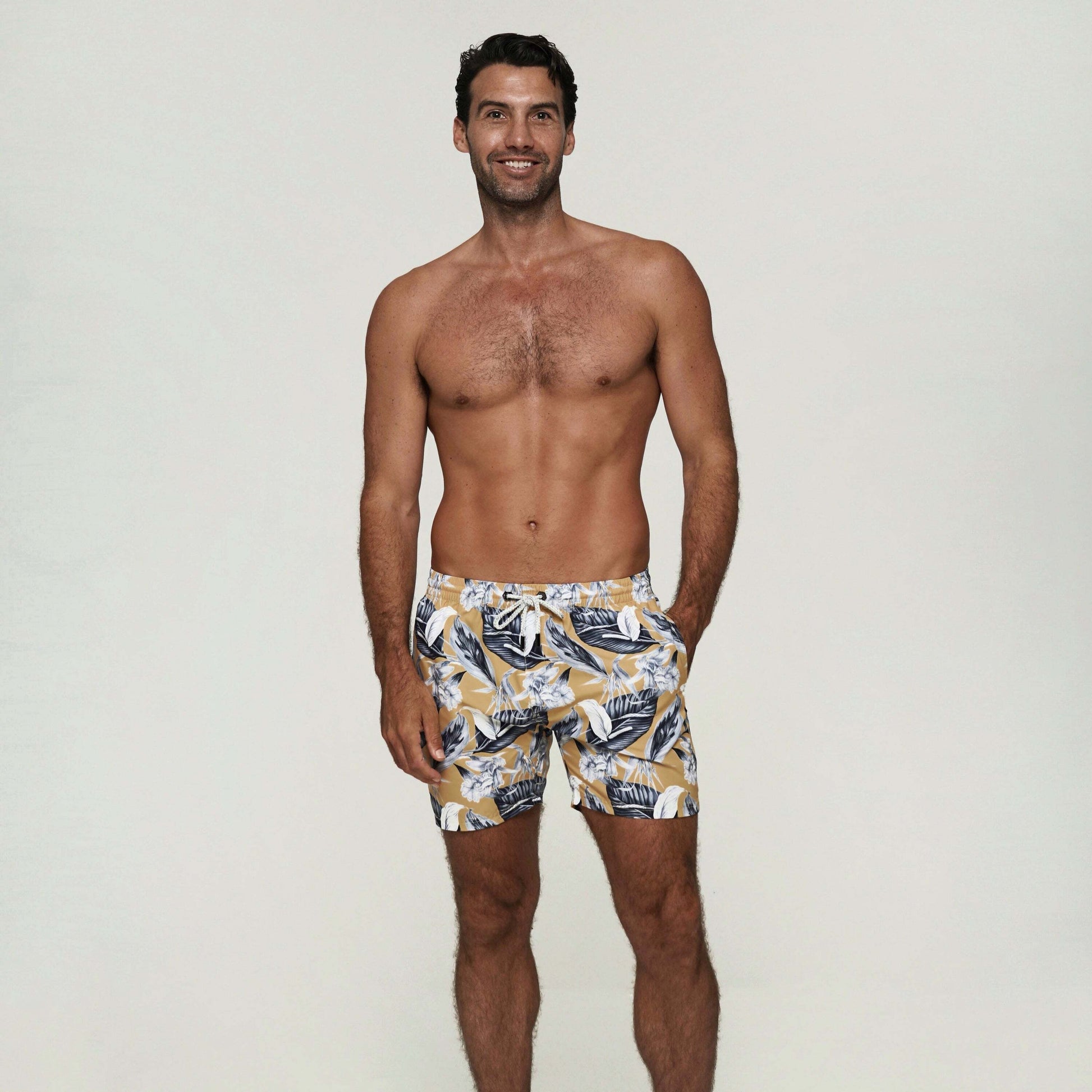 Setzte ein modisches Statement mit den Hastings Badeshorts für Männer. Diese funky Beachwear besticht durch ihren tropischen Aufdruck mit Paradiesvogelblumen, üppigen Blättern und weissen Blüten auf einem goldenen Hintergrund. Ein echter Hingucker, der am Strand für Aufsehen sorgt! Dieses modische Statement vereint modernes Design mit sommerlicher Frische - perfekt für den trendbewussten Mann.