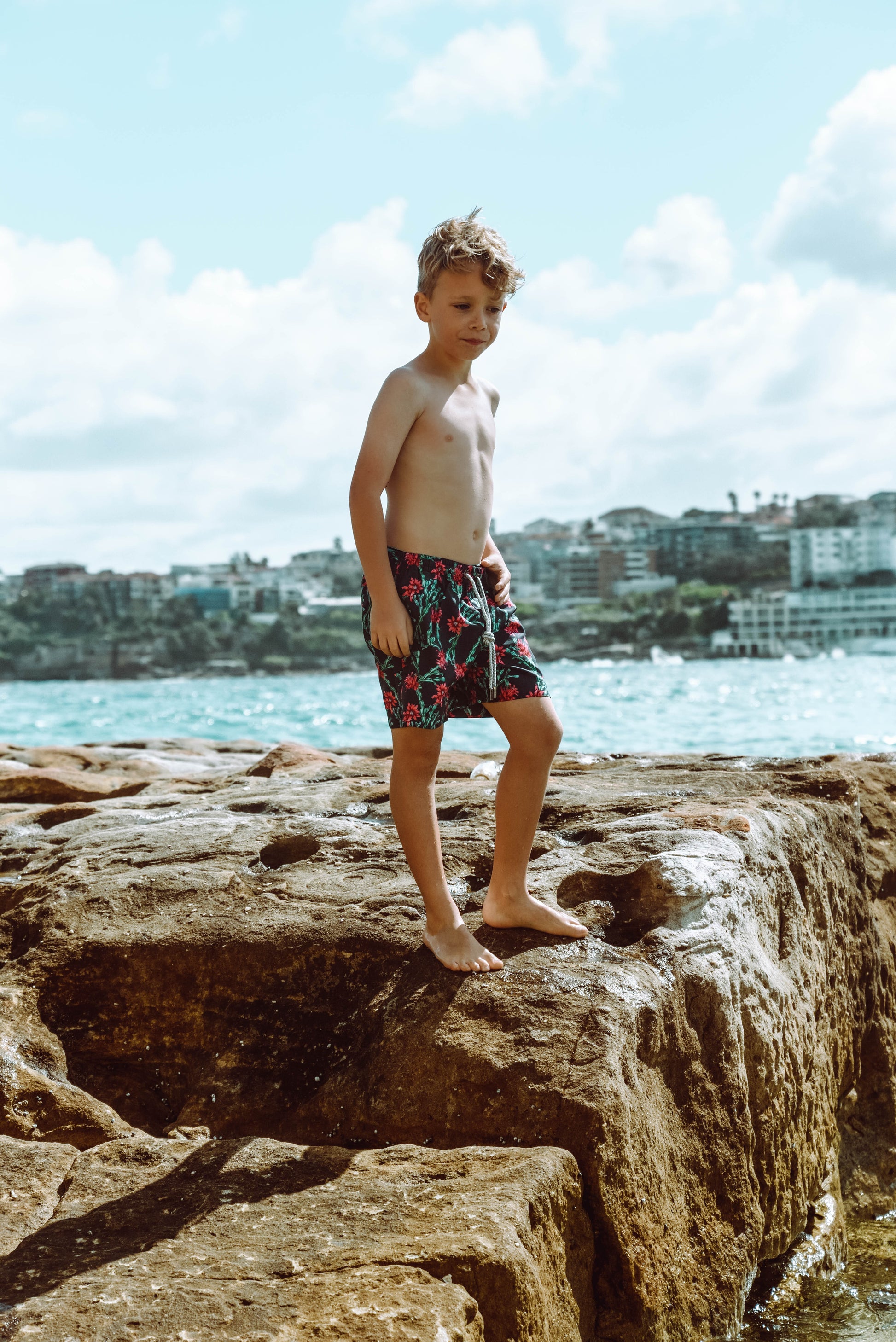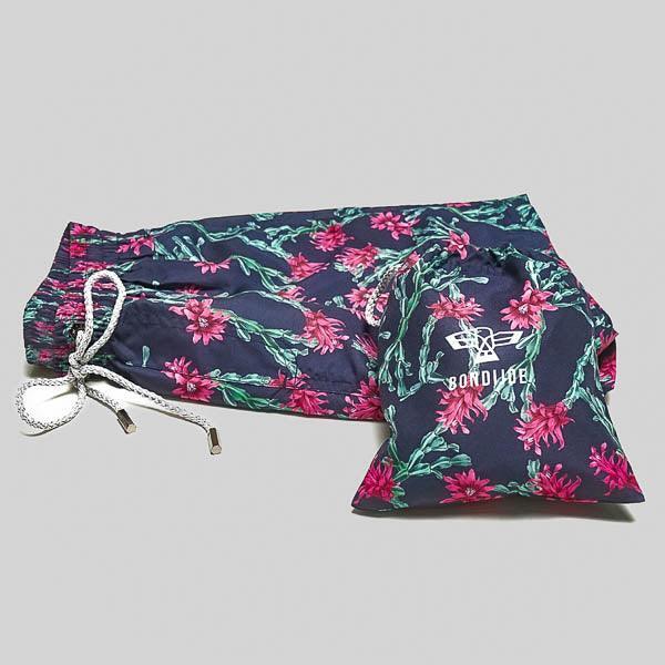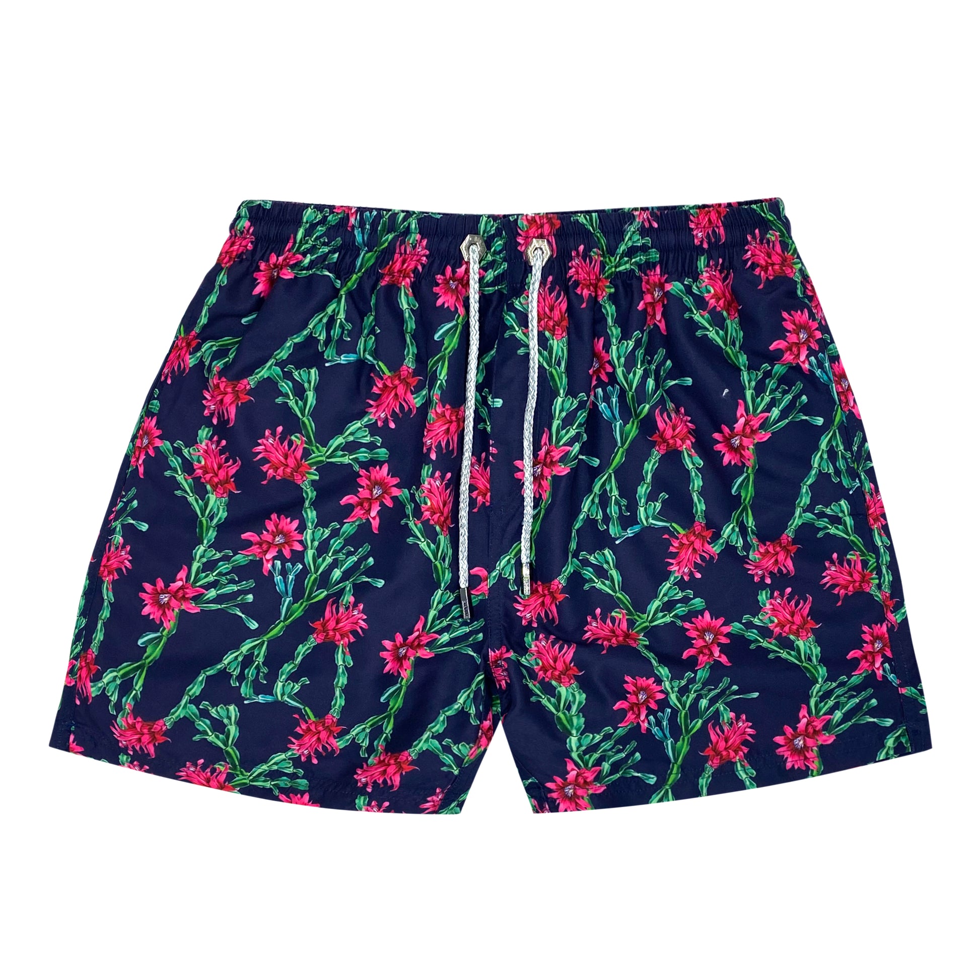 Sei diesen Sommer mutig am Strand mit den Wonderland Kinder-Badeshorts. Hebe dich durch den auffälligen tropischen Zygo-Kaktus-Druck mit rosa und grünen Reflexen auf einem klassischen Hintergrund in dunkler Marine ab.